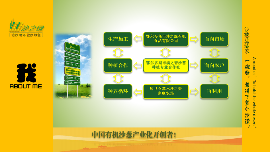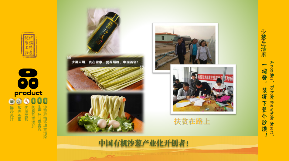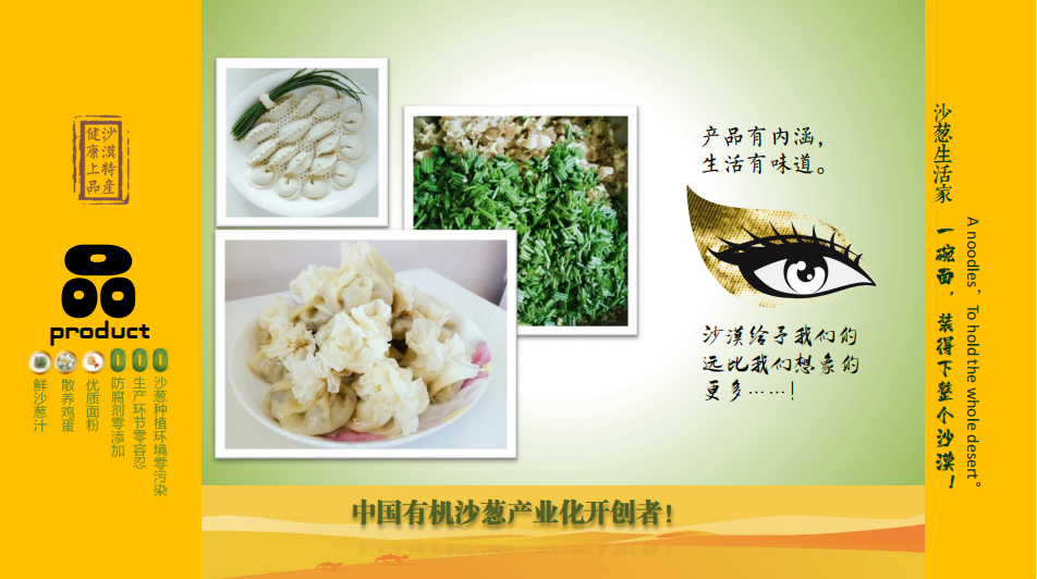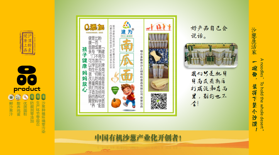 鄂爾多斯市有機食品有限公司坐落于達拉特旗展旦召蘇木王馬駒五社,現(xiàn)擁有土地882畝。累計投資2000萬元,建成加工車間400平方米,保鮮庫100平方米,包裝材料庫200平方米,成品庫100平方米,輔助車間200平方米,引進水浸沙蔥半自動生產(chǎn)線1條(包括清洗、烘干、脫水、脫鹽、切段、混料、灌裝等設備),同時配有掛面生產(chǎn)線1條,餅干生產(chǎn)線1條,沙蔥醬生產(chǎn)線1條 。正常運行,年標準化精細深加工沙蔥500噸,2014年8月沙蔥產(chǎn)品取得有機認證,2015年6月有機沙蔥上市銷售。合作社現(xiàn)有職21工人,其中技術員9名,其中貧困農(nóng)戶職工7人。公司已注冊沙之綠、漠之青、沙之美、沙之夢、蒙韭沙莊、媽鄉(xiāng)伴、沙漠男人、大法令、者別、建為、逍什等12個名稱及標志,共計40多個商標,相關包裝設計外觀專利保護9個,一個國家發(fā)明專利,另有三個專利正在申請中。