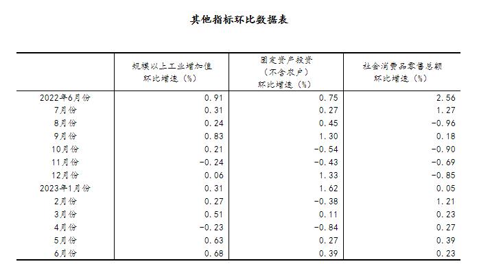 (2)根據(jù)季節(jié)調(diào)整模型自動修正結(jié)果,對近一年來各期國內(nèi)生產(chǎn)總值、規(guī)模以上工業(yè)增加值、固定資產(chǎn)投資(不含農(nóng)戶)、社會消費(fèi)品零售總額環(huán)比增速進(jìn)行修訂。修訂結(jié)果及2023年二季度GDP環(huán)比數(shù)據(jù)、2023年6月份其他指標(biāo)環(huán)比數(shù)據(jù)如下: