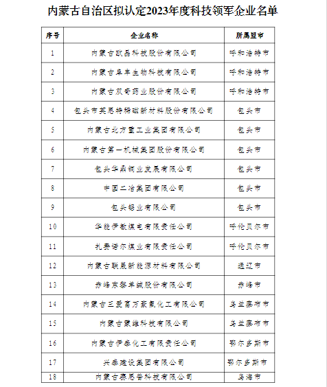 為推動實施創(chuàng)新型企業(yè)“雙倍增、雙提升”行動,促進科技型企業(yè)創(chuàng)新發(fā)展,按照《內(nèi)蒙古自治區(qū)科學(xué)技術(shù)廳關(guān)于組織開展2023年度內(nèi)蒙古自治區(qū)科技領(lǐng)軍企業(yè)申報工作的通知》要求,經(jīng)企業(yè)申報、盟市科技局、國家級高新區(qū)審核推薦、自治區(qū)科技廳組織專家評審并對重點企業(yè)進行實地核查等程序,在有效期內(nèi)的高新技術(shù)企業(yè)中評選出行業(yè)里創(chuàng)新能力強、成長性好、具有一定知名度和較強的產(chǎn)業(yè)創(chuàng)新帶動能力的20家企業(yè)為自治區(qū)科技領(lǐng)軍企業(yè)。現(xiàn)對擬認定2023年度自治區(qū)科技領(lǐng)軍企業(yè)名單進行公示(名單見附件)。